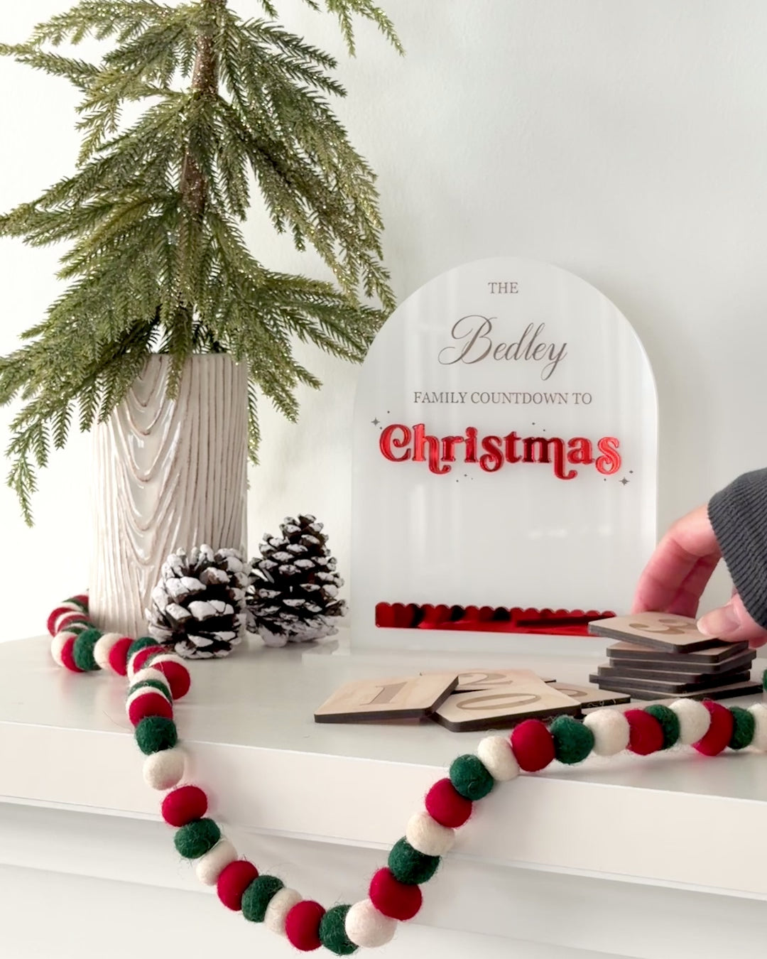 - Choose between mirrored red, mirrored gold, or scarlet red (solid, not mirrored) for the numbers ledge and "Christmas"