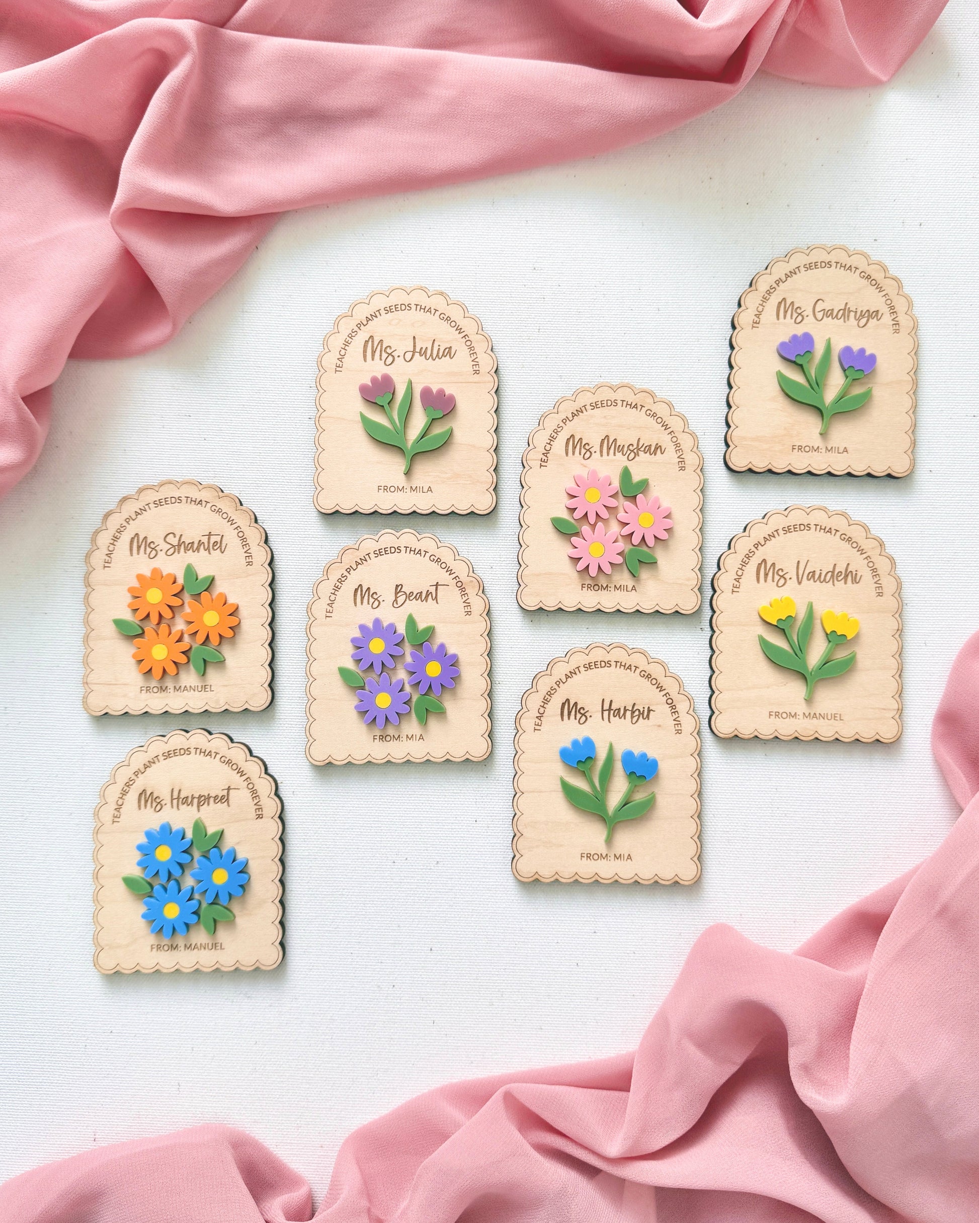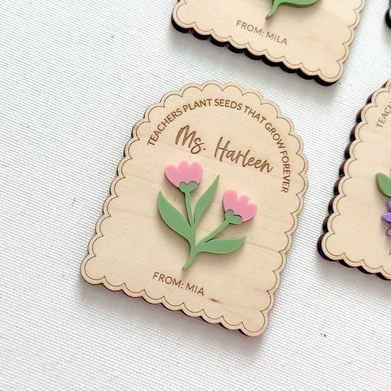 Show your gratitude to the best teachers in the world with a keepsake that says it all! This wooden and acrylic magnet features the heartfelt quote, "Teachers plant seeds that grow forever", with colorful acrylic flowers blooming at its center. Personalize it with your teacher’s name and your child’s name to make it truly special. Choose the flower colours to match their style and bring a personal touch they’ll cherish for years.