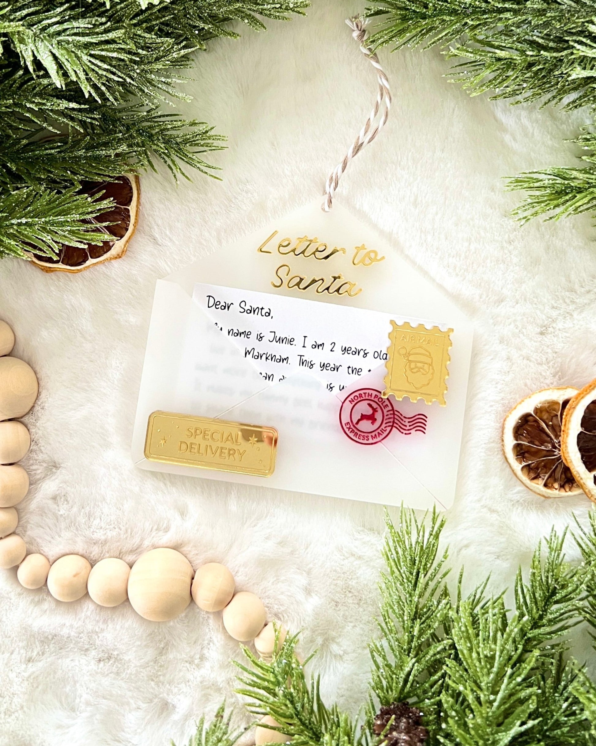 Watch your little one's Christmas wishes come to life with this enchanting Letter to Santa ornament! Made with layered white and mirrored gold acrylic, it features a slot for their letter or wish list. A whimsical keepsake for families or a perfect gift to spread holiday cheer!