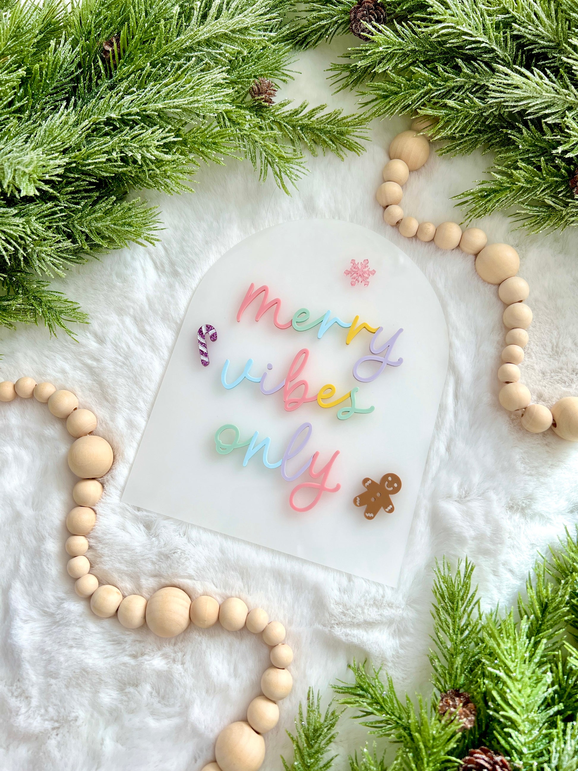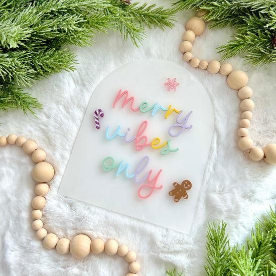 Cue the festive fun—because it’s Merry Vibes Only around here! This colourful, layered acrylic sign brings a burst of whimsy with its vibrant hues and handwritten charm. Perfect on top of your fireplace mantel or shelves, it’s the ultimate playful pop of holiday magic for your home or nursery!