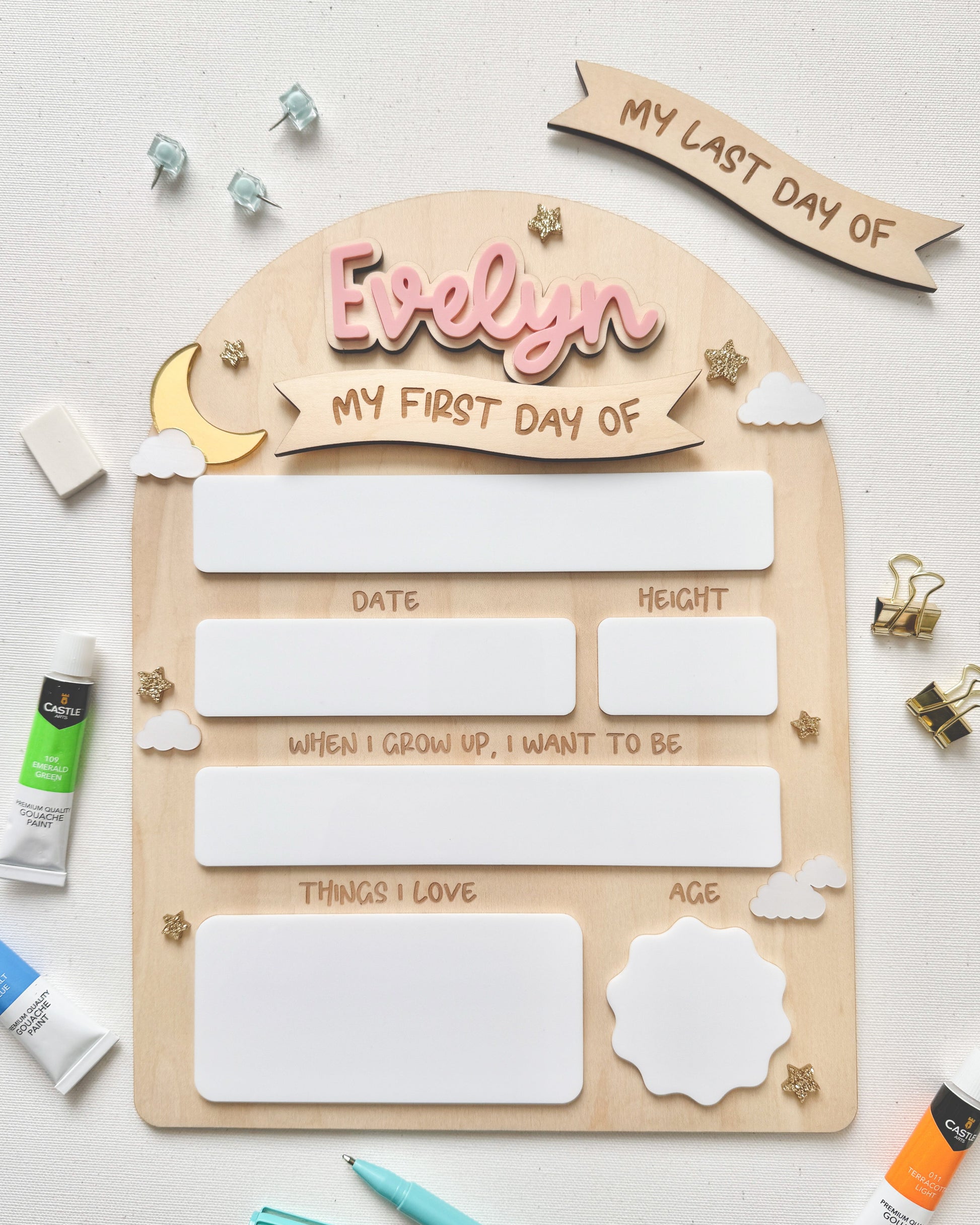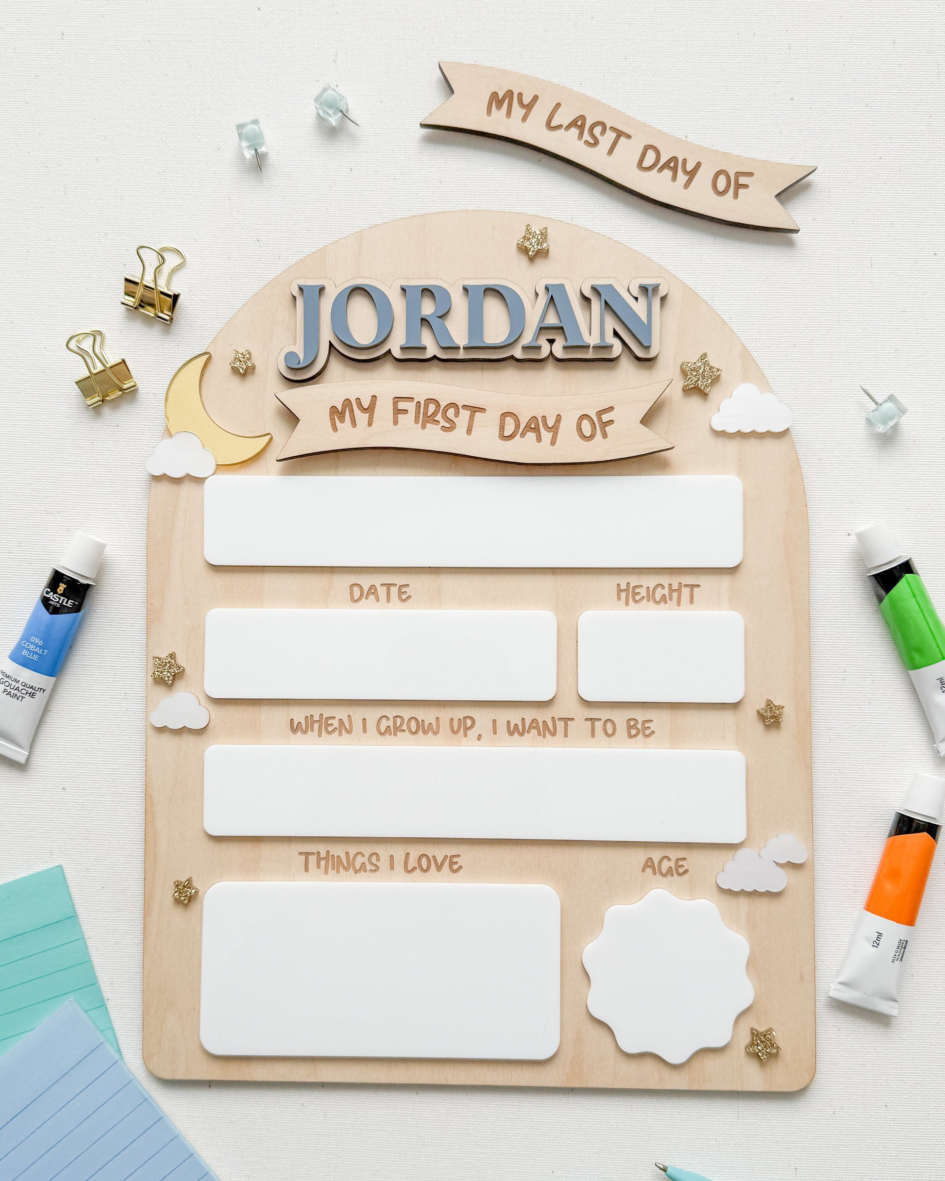 - Includes 1 "my first day of" and 1 "my last day of" plaques that are removable using velcro dots