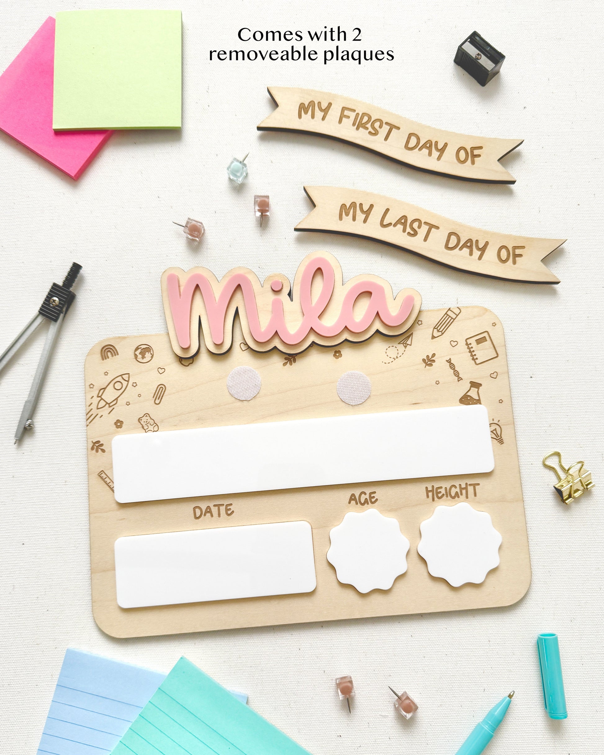 - Includes 1 "my first day of" and 1 "my last day of" plaques that are removable using velcro dots